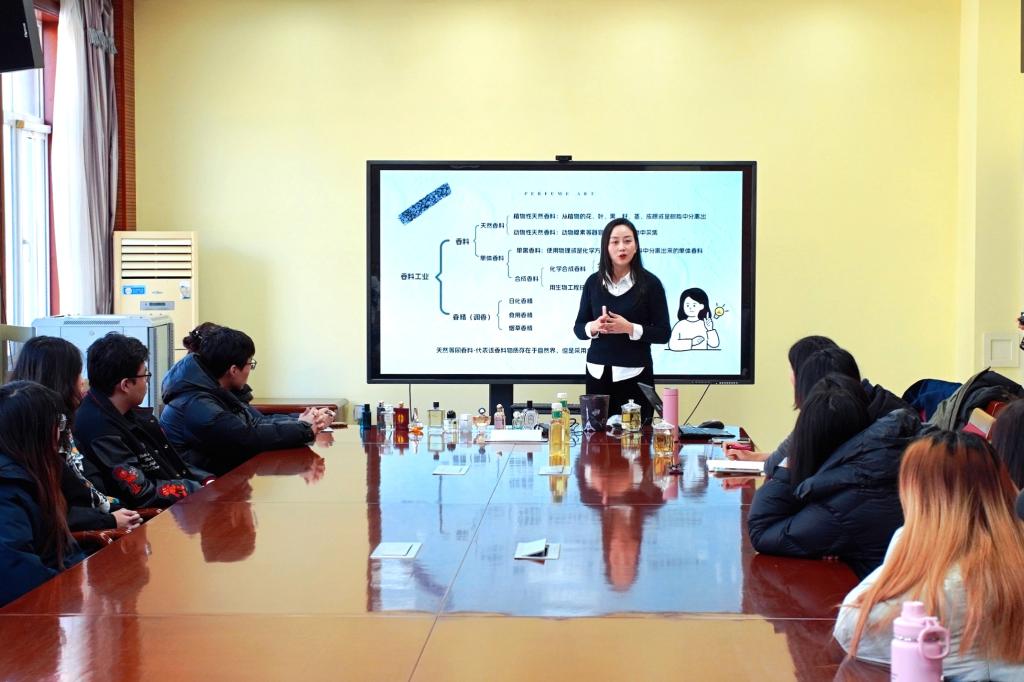 现场设置的香水品鉴环节尤为引人入胜,学生们在陈敏老师的引导下,亲身感受不同香料的层次与韵味,实现了理论与实践的生动结合。互动环节,同学们就调香学习、资格认证、就业方向等踊跃提问,陈敏老师均给予了细致解答与针对性指导。