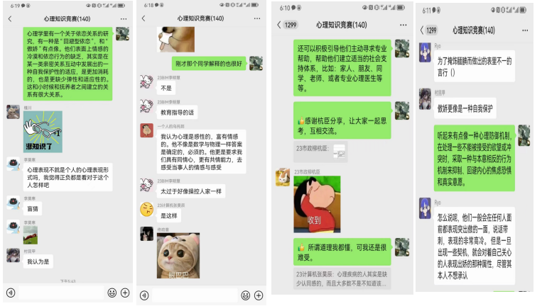 活动开启后,同学们确立了“以赛促学,学以致用”的目标,并通过心理中心设计的线上题库进行学习。同学们竭尽全力学习、温习心理健康知识,认真备赛。在备赛期间,同学们的学习热情非常高涨,经常将每天学习的心理知识发到群中进行讨论,心理中心的老师对同学们提出的问题逐一解答。