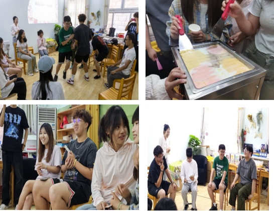破冰游戏后,张老师带领同学们进行了冥想体验,邀请同学们选择不同口味不同颜色的酸奶粉代表自己期盼的感情状况或目前的感情状,使用牛奶进行调配,调配好后使用炒酸奶机进行颜色画面创造、塑形制作。小组分享制作过程中的感受,作品含义,描述自己期待的爱情,以及自己在爱情中的困惑、爱情价值观等。张老师还向同学们介绍了美国心理学家斯腾伯格提出的爱情三元理论,以及三种元素的不同组合形式构成的七种爱情形式。随后,张老师向团体成员分发了一组恋爱卡牌,卡牌上是对恋人的形容。每位同学从中随机抽取四张,假设你的恋人具备着卡牌上的特性,请同学之间相互点评每种恋人的优劣,在“随机分配恋人”的过程中,同学们总能发现自己不太满意的特性,感悟着恋爱不可随意,需谨慎对待的道理。紧接着,张老师改变规则,让团体成员从剩下的牌堆中选取,决定是否用它替代手中的卡牌,并且说明替换的原因,直到最终选出心中最理想的恋人。在这一过程中,每位同学进行了恋爱观念的交流,心中的理想恋人也逐渐清晰和完善,在往后的时光中必将减少迷茫,找到正确的人。随后,张老师邀请同学们抽取一张探索卡,回答上面的问题,轮流分享自己的问题及答案。活动中,团体成员们品尝了自己亲手制作的炒酸奶,活动在愉快的氛围中结束。