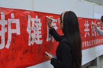 活动现场,团委宣传部通过摆放控烟展板、横幅签名、积极营造控烟宣传氛围,志愿者们向参加签字活动的同学们讲述吸烟存在的危害,并向全院师生发出“无烟为成长护航”的倡议,呼吁师生们积极加入到控烟行列中来。参与活动的学院领导、老师及现场同学们纷纷在控烟宣传横幅上写下自己的名字,引导大家远离烟草,崇尚健康文明生活,树立良好的社会风尚和行为习惯。
