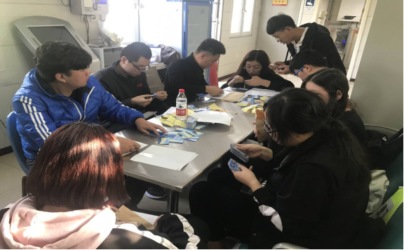 到了德胜门公交总站后,大家首先领取了卡片等资料,之后很快进入了工作状态。为了能更高效的完成这次任务,把全部成员分成两组,每个组各自安排好工作内容。工作流程总共分为6个环节。其中包括:加盖印章、填写学生信息、修剪粘贴照片、贴防伪标签、贴卡片、贴公交卡保护膜。最后检查无误后,按照专业班级将所有公交卡装入信封。