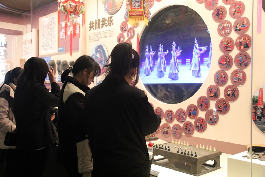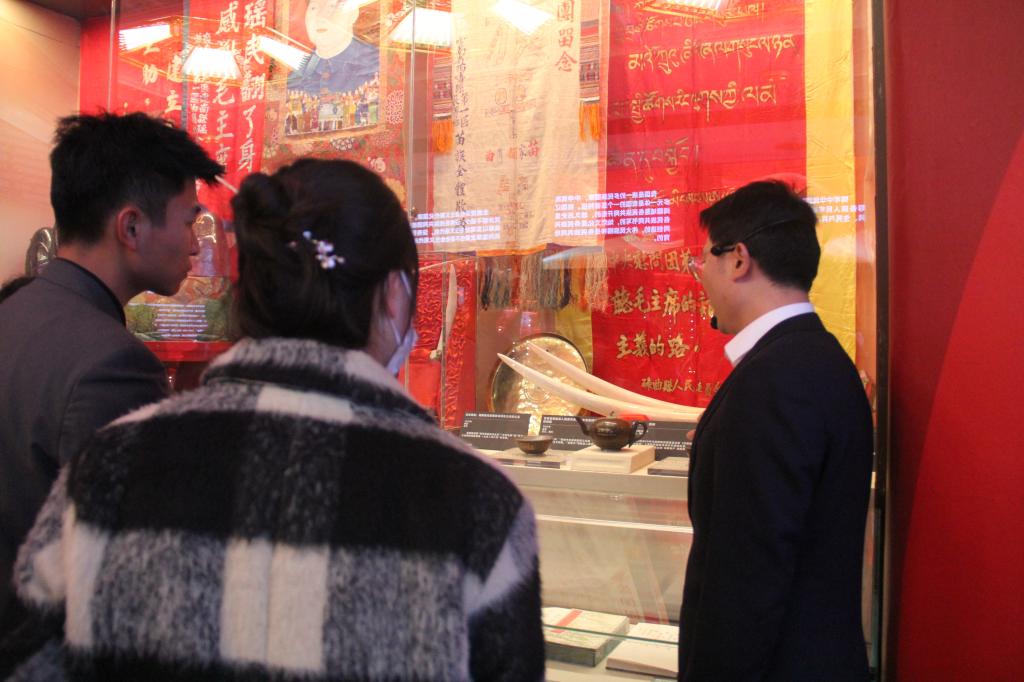 漫步在展厅内,在工作人员的精彩讲解下,大家如同遨游在几千年来古朴厚重的中华文明历史长河之中。琳琅满目又极具民族特色的古籍、服饰、乐器等文物在橱窗内悄声向人们诉说着中华民族交往、交流、交融的历史故事。在展览中,大家深入探寻民族团结的文化根脉,被各种文物古籍深深吸引,不时驻足观看,仔细阅读相关介绍。同学们通过近距离观摩珍贵的历史资料,认真聆听古籍文物、民族服饰、民族特色展品背后的故事,用心体会中华民族在漫长历史进程中,各民族共同创造发展的斑斓文化,感受到“四个与共”的中华民族共同体理念,也感受到波澜壮阔的中华民族发展历史,更是深刻感悟到中国共产党百年民族工作的伟大成就。