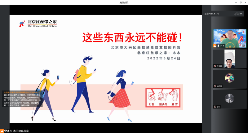 本次活动中,围绕“6.26国际禁毒日”主题,开展禁毒方面知识,包括各类毒品、尤其新型毒品的介绍和毒品与艾滋病感染病例三个面讲解,让同学们充分认识和了解到毒品,能够更好地明白毒品的危害和更好地做好个人防范。同时,来自医科大学附属地坛医院杨思园医生介绍关于防艾的相关知识,非常详细地讲解了艾滋病的历史、全国病的流行情况、一些相关的术语和定义、艾滋病病毒侵犯人体免疫细胞的过程、艾滋病的传播途径和条件、HIV感染后的临床特点、艾滋病检测的窗口期、艾滋病预防相关知识。让更多的人了解艾滋病、正视艾滋病,更好地预防艾滋病。然后也给我们介绍了新冠肺炎、预防新冠肺炎的相关知识。