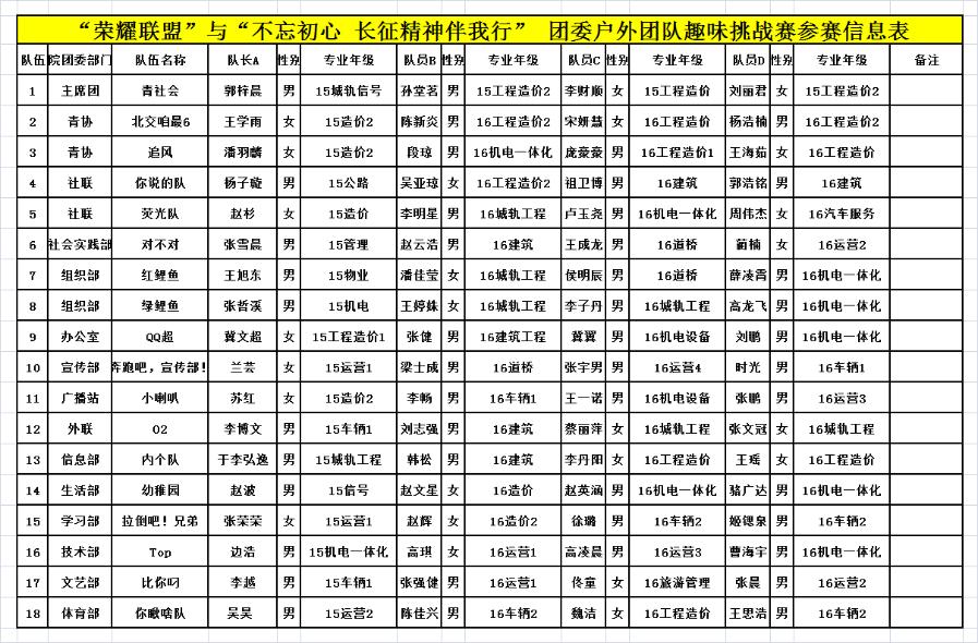 为丰富院团委、社团联合会、青年志愿者系会、院学生会学生干部机构的活动,增进交流和各机构之间的了解,使我院学生的户外活动更加多元化,提高我院团委学生干部各项素质,院学生会体育部于2016年11月17日在教一楼221教室举行ky电竞馆“荣耀联盟”团委户外团队趣味挑战赛与“不忘初心 长征精神伴我行” 院团委青年户外挑战赛启动仪式,院团委老师颜金海、院团委各部、院学生会、青年志愿者协会、社团联合会各代表参加了本次会议。本次活动全院共18支队伍计72名学生参加。