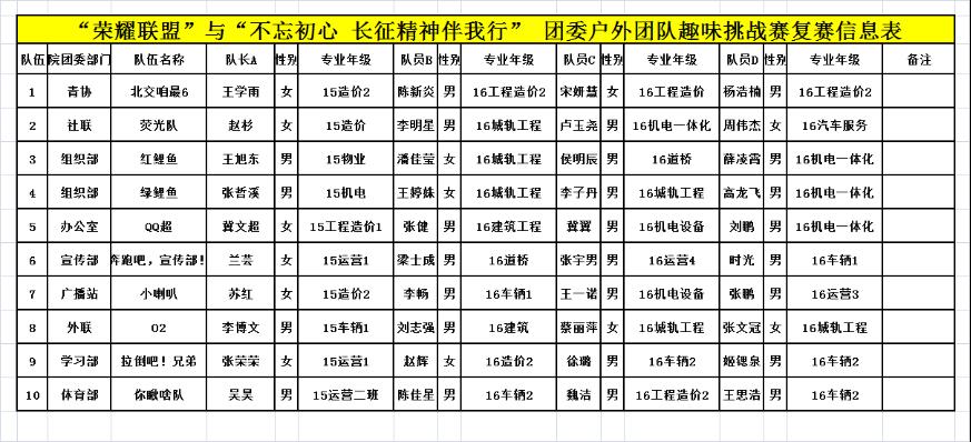 为丰富院团委、社团联合会、青年志愿者系会、院学生会学生干部机构的活动,增进交流和各机构之间的了解,使我院学生的户外活动更加多元化,提高我院团委学生干部各项素质。2016年11月24日,院学生会体育部于教四楼形体房举行ky电竞馆“荣耀联盟”团委团队趣味挑战赛与“不忘初心 长征精神伴我行” 院团委青年户外挑战赛--初赛,院团委老师颜金海、院团委各部、院学生会、青年志愿者协会、社团联合会各代表参加了本次会议。本次活动全院共18支队伍计72名学生参加。