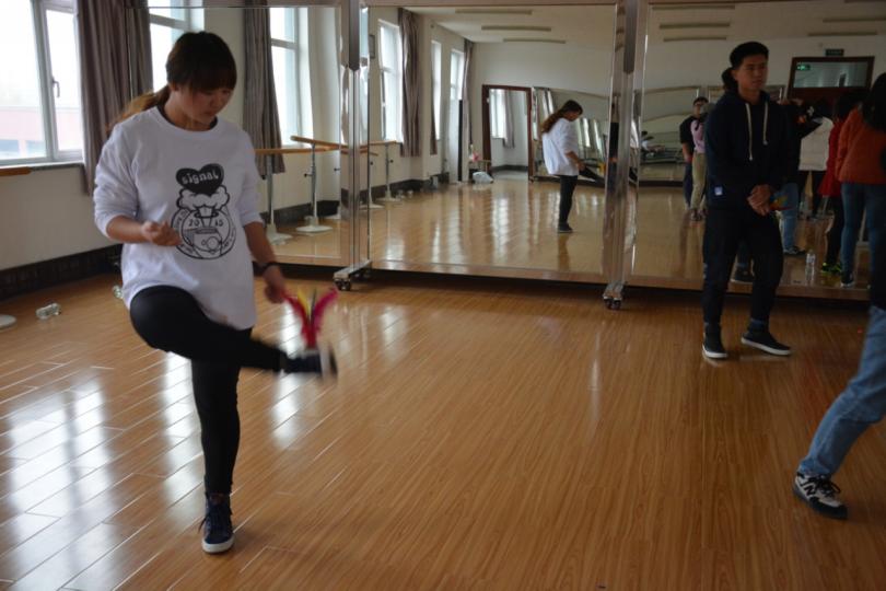 第一个活动是抛球引分、顶橘子、吹气球、踢毽子(四人团体),此项比赛在教四楼形体房内开展,第一场比赛的最佳队伍是由院学生会学习部部长及干事组成,他们的比赛用时最短且分数最高。
