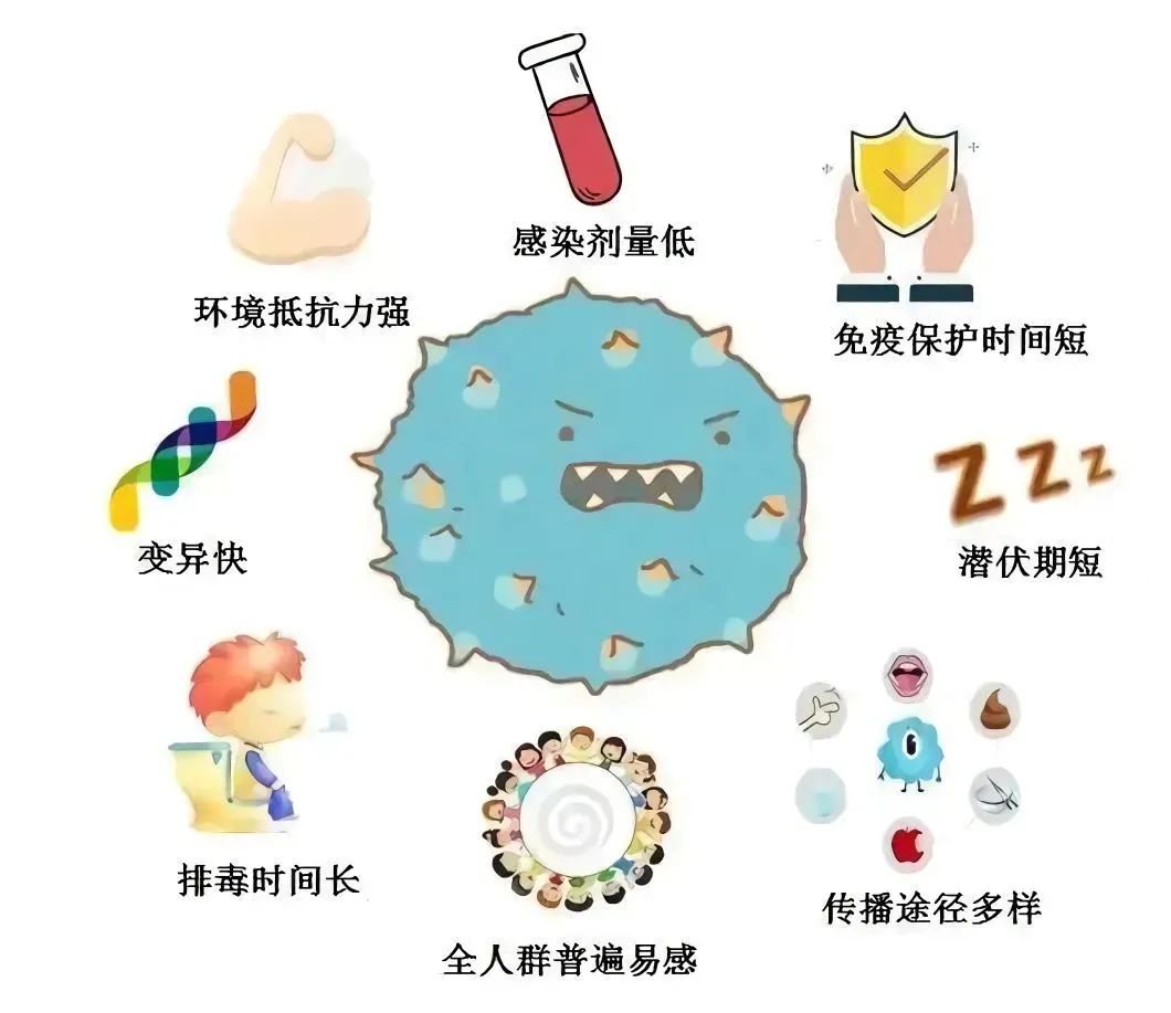 诺如病毒具有感染剂量低(低至18个病毒颗粒即可引起感染)、感染后潜伏期短(通常24-48小时)、排毒时间长(排毒高峰在发病后2-5天,持续约2-3周)、外环境抵抗力强(可在0-60℃温度范围内存活)、免疫保护时间短(感染后免疫保护持续6-24个月,同一个体可重复感染同一毒株或不同毒株的诺如病毒)等特点。