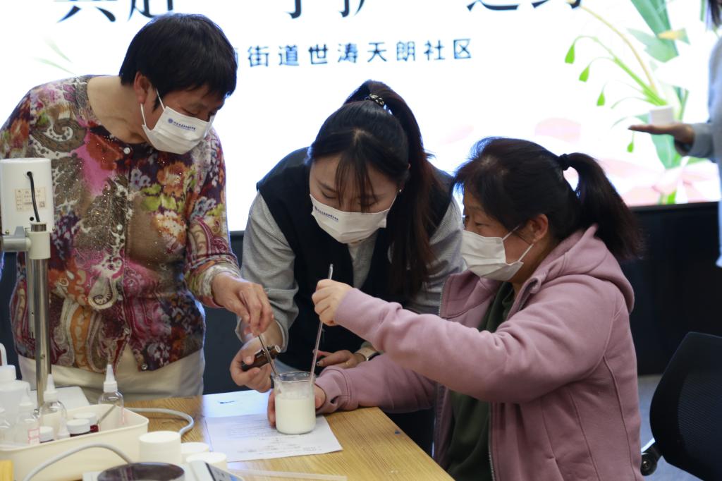 我院管理系主任陈晓燕携管理系教师团队和志愿者们全心投入,精心准备了丰富多样的化妆品原料和DIY工具,为居民们提供了亲自动手的机会,让他们在实践中体验到制作化妆品的无穷乐趣与成就感。