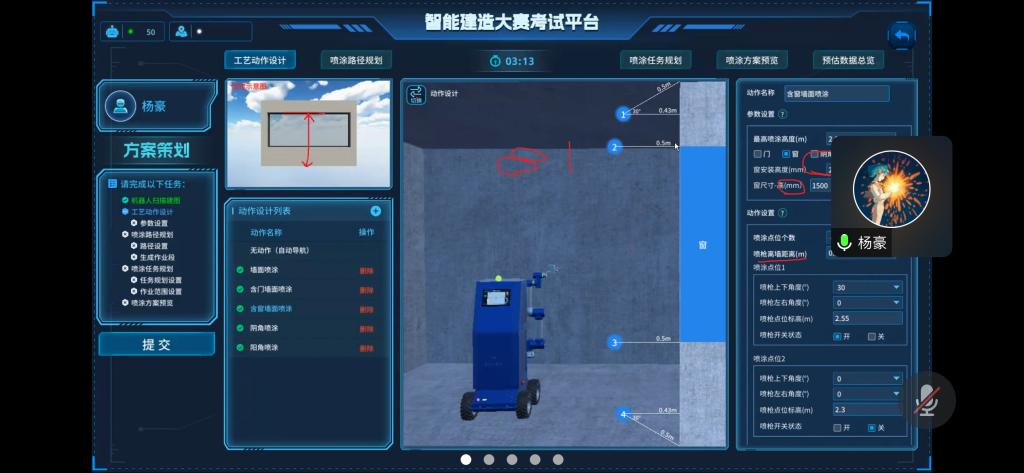 主要考察参赛选手建筑机器人基础原理、本体结构、喷涂工艺、施工作业、安全标准及维护保养等知识,能够应用建筑机器人施工策划系统,完成建筑机器人“认知学习、施工准备、方案策划、喷涂准备、路径规划、参数设定、作业模拟和施工结束”等考试内容。