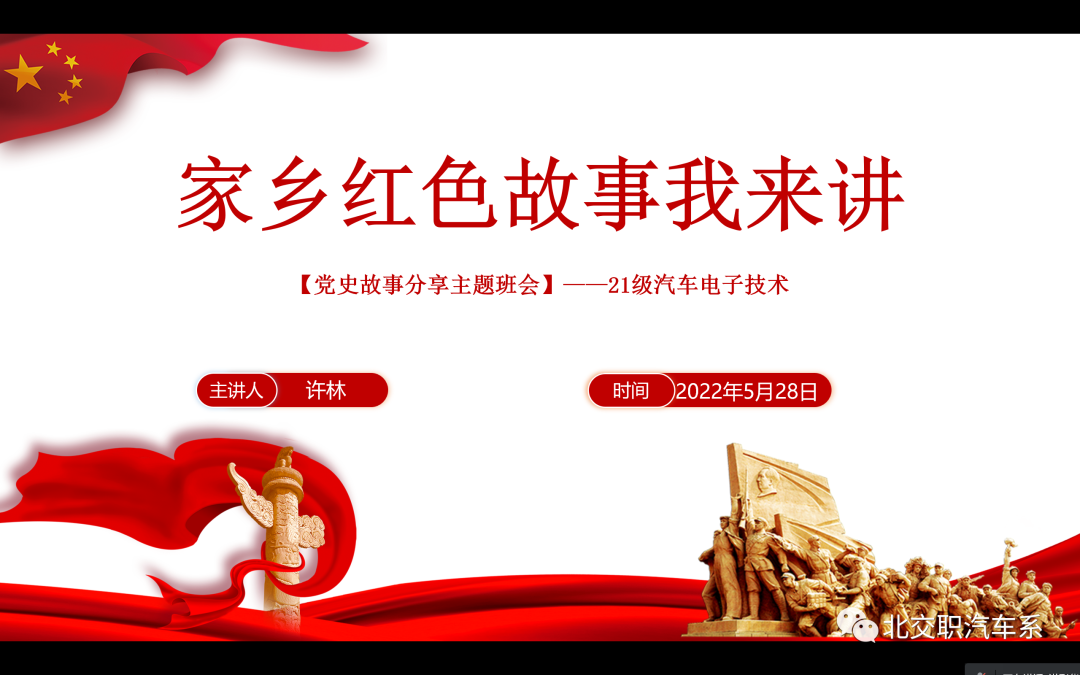 为增强学生爱党爱国情感,深入推进党史学习教育,缅怀革命先烈,回顾党的光辉历程,厚植爱国爱党情怀,ky电竞馆汽车系各班分别举办的“家乡红色故事我来讲”宣讲活动,汽车系各班同学都积极参与。此次红色宣讲活动重点围绕家乡红色故事,讲述中国共产党人和红色革命事迹。同学们将红色事迹与缅怀革命先烈、传承红色基因紧密结合,慷慨激昂地讲述了一个又一个感人至深的红色故事,同学们声情并茂,采取幻灯片、视频相结合的方式,对家乡红色故事进行生动的宣讲,带领大家重温革命年代共产党人的峥嵘岁月。