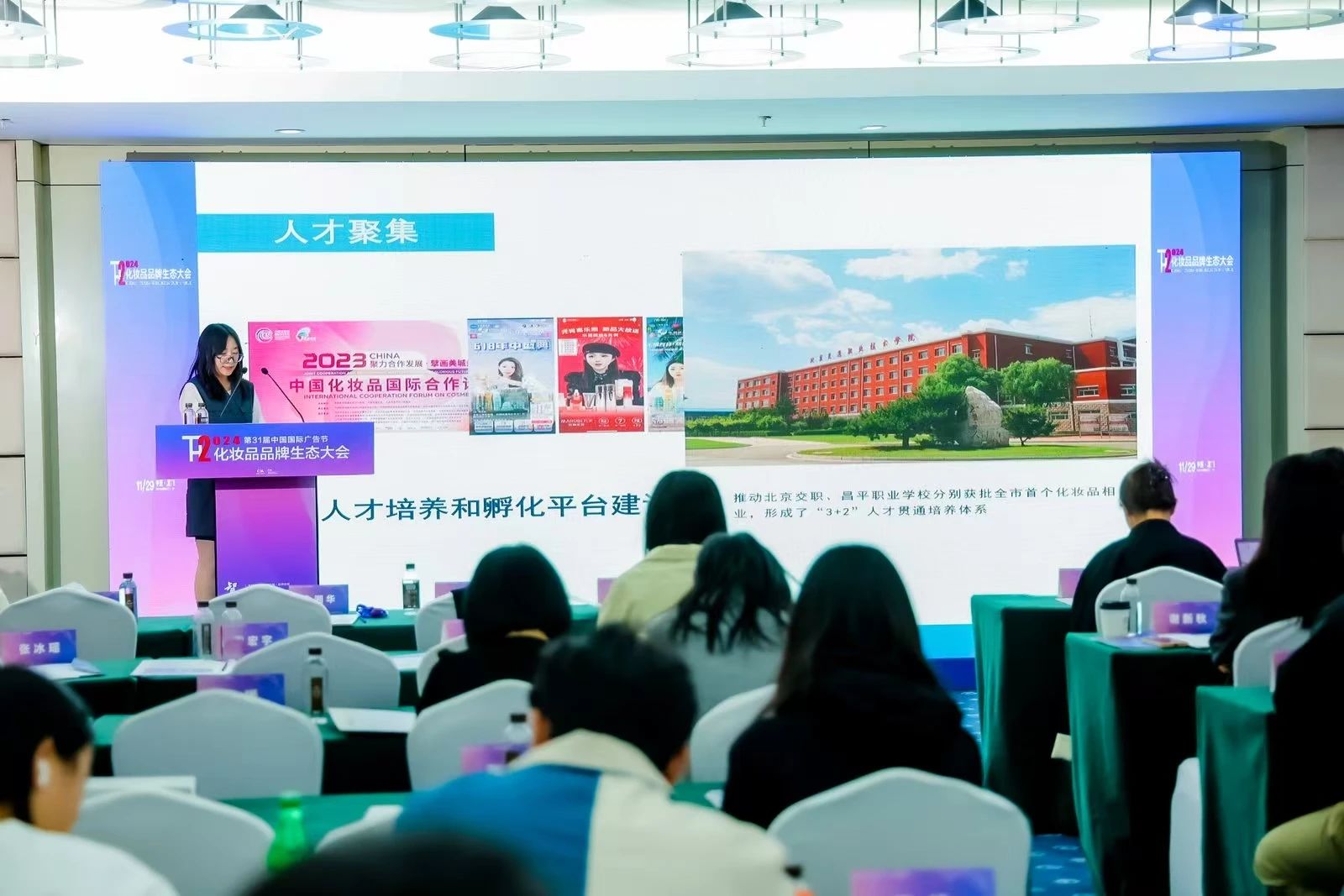 2024年11月29日,备受瞩目的第二届化妆品品牌生态大会在厦门国际会展中心成功举办,作为第31届中国国际广告节的核心活动之一,此次大会汇聚了行业内众多精英与专家。作为协办单位我院管理系主任陈晓燕及教师高润应邀出席,同时,23级化妆品经营与管理专业的王正炎、杨淑宇两位同学作为志愿者,助力大会的顺利举办。