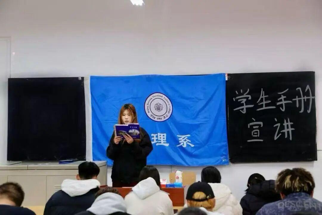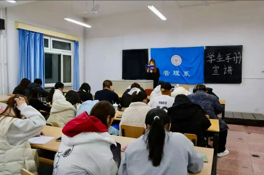 宣讲伊始,管理系学生会团总支副书记万美婷、常务主席齐明萱及组织部部长付金悦分教室开展宣讲。结合新生校园生活实际,系统阐述了学习《学生手册》对适应大学环境、规划学业生活的重要意义,同时明确《学生手册》考试的具体要求与考核重点,要求新生认真聆听、主动提问,切实将手册内容学深悟透。接下来,她们针对《学生手册》为同学们开展宣讲,通过梳理重点、点明注意事项的方式,帮助大家精准把握手册核心,加深理解。
