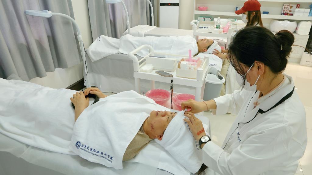 座谈交流结束后,与会人员移步至三层皮肤管理教学实践中心,进行教学成果体验交流--由管理系化妆品经营与管理专业的师生为汽车系党支部的女党员同志提供专业的面部皮肤护理服务。体验结束后,管理系党支部书记滕辉表示,感谢汽车系各位党员同志根据自身的体验感受提出的宝贵意见和建议,不仅为学生提供了一次难得的实践机会,同时还共同提升了化妆品经营与管理专业的服务水平。